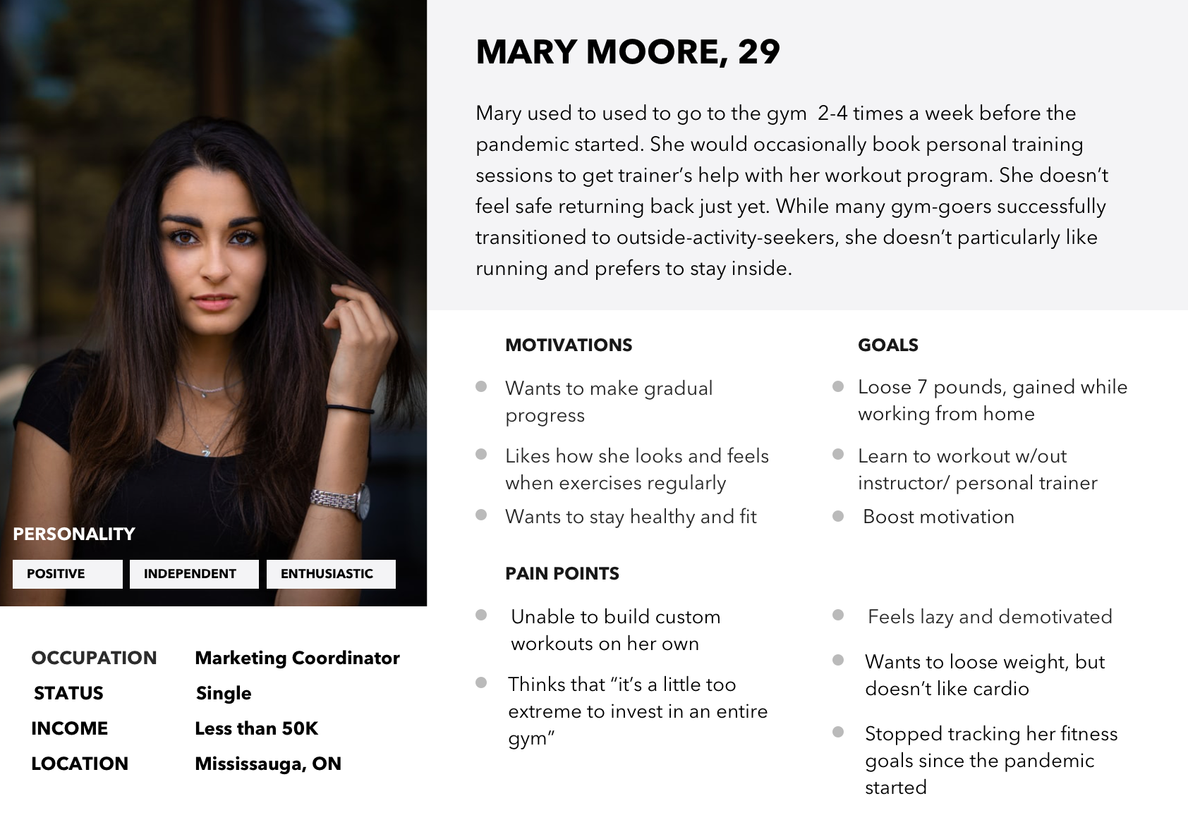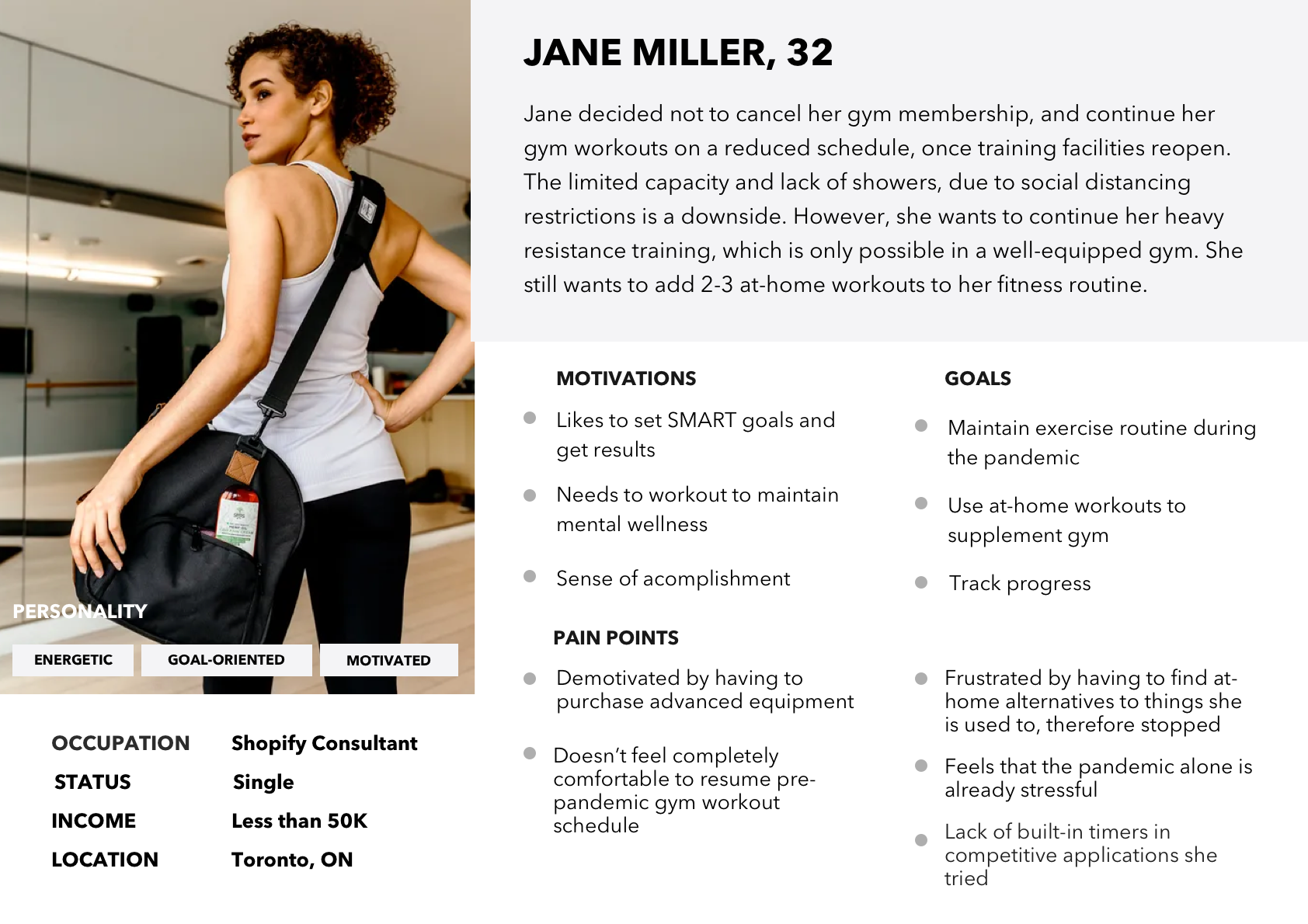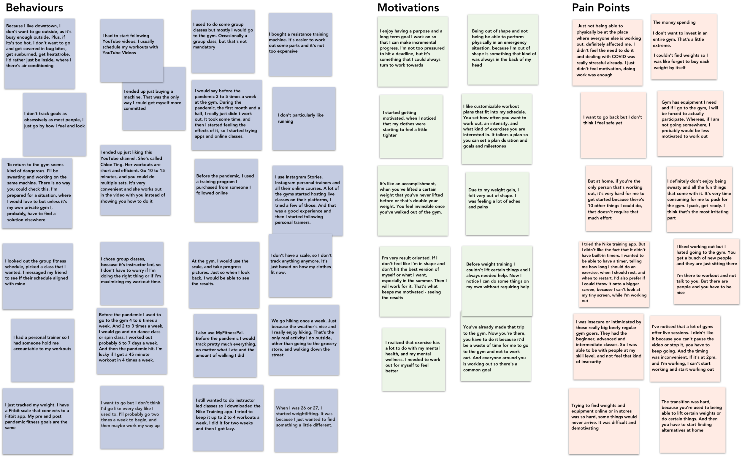 To develop a deeper understanding of my target audience, I prepared an interview script and recruited three former gym-goers to conduct interviews. My plan was to focus on having my interviewees describe their pre-pandemic and current behaviours. Questions were primarily open ended and varied from general (“When did you first start working out and why?”,”What keeps you motivated and consistent in achieving your fitness goals”) to more specific (“How often did you work out before the pandemic, and what’s your training schedule now?”, “What do you find the most challenging about managing your fitness and health routine at this time?”). They were followed by additional “whys”, depending on how the conversation went.