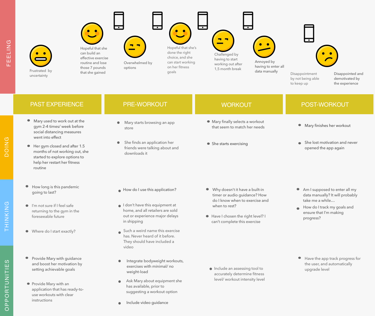 Experience map: Mary’s past experience, pre-workout, workout and post-workout journey
