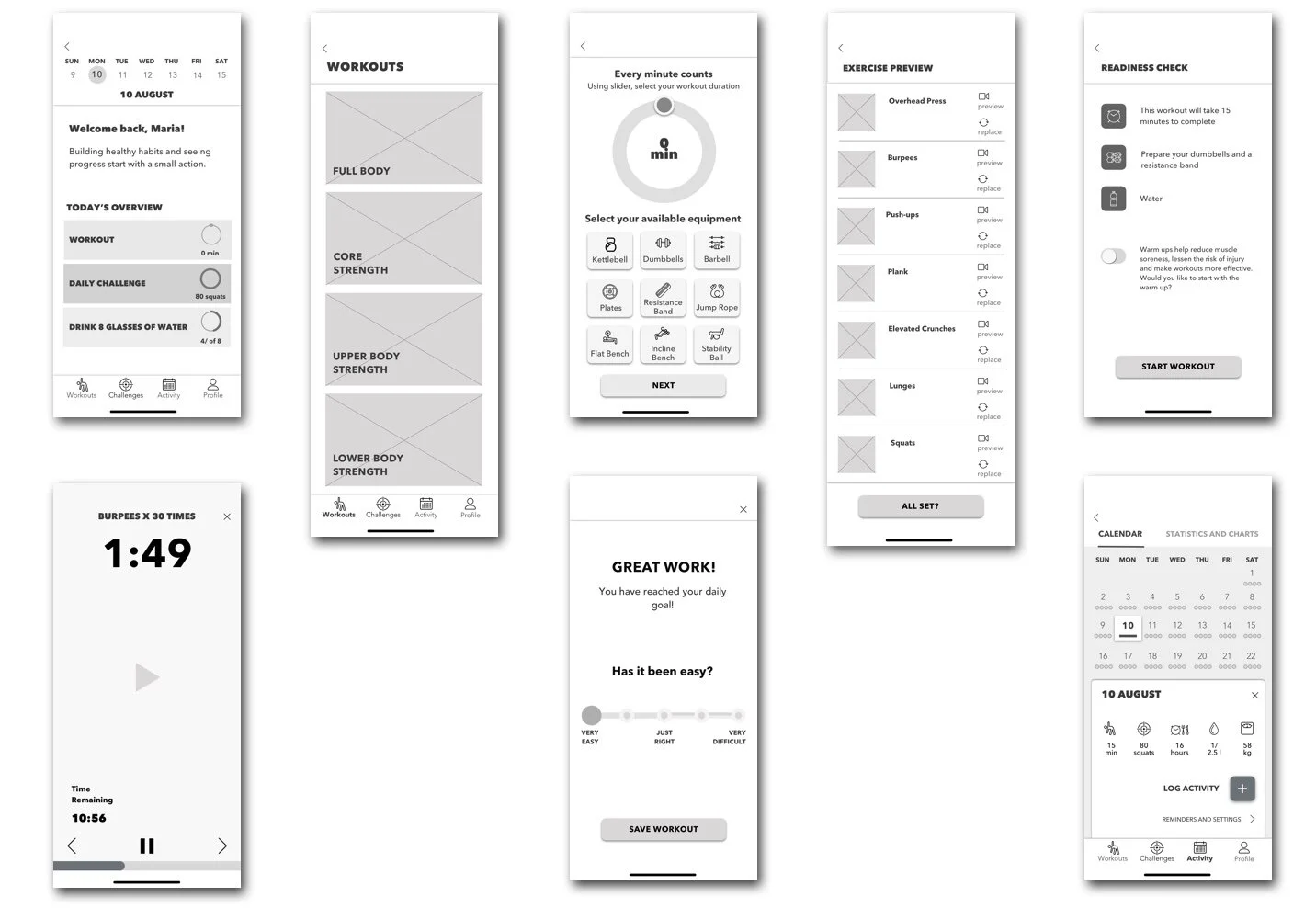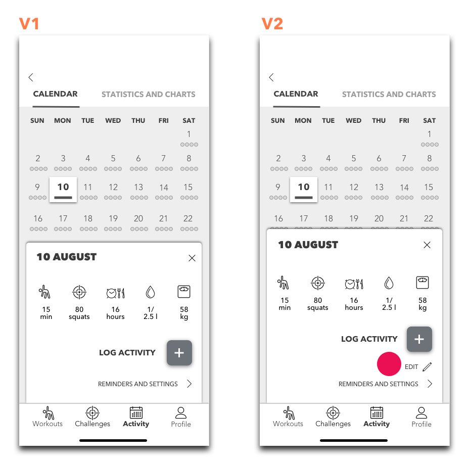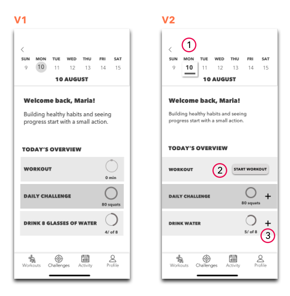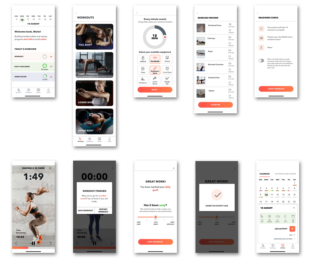 The tasks were quite straightforward and aimed to test navigation from the home screen, interactive features and the clarity of an overall flow, from selecting a workout to logging it to activity log. User feedback was implemented to improve features, structure and design of the product.
