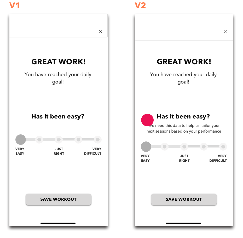When I created the “Save Workout ” CTA button I assumed it’d be self-explanatory that completed activity would be automatically logged. In reality, it was confusing for most users, and required clarification.