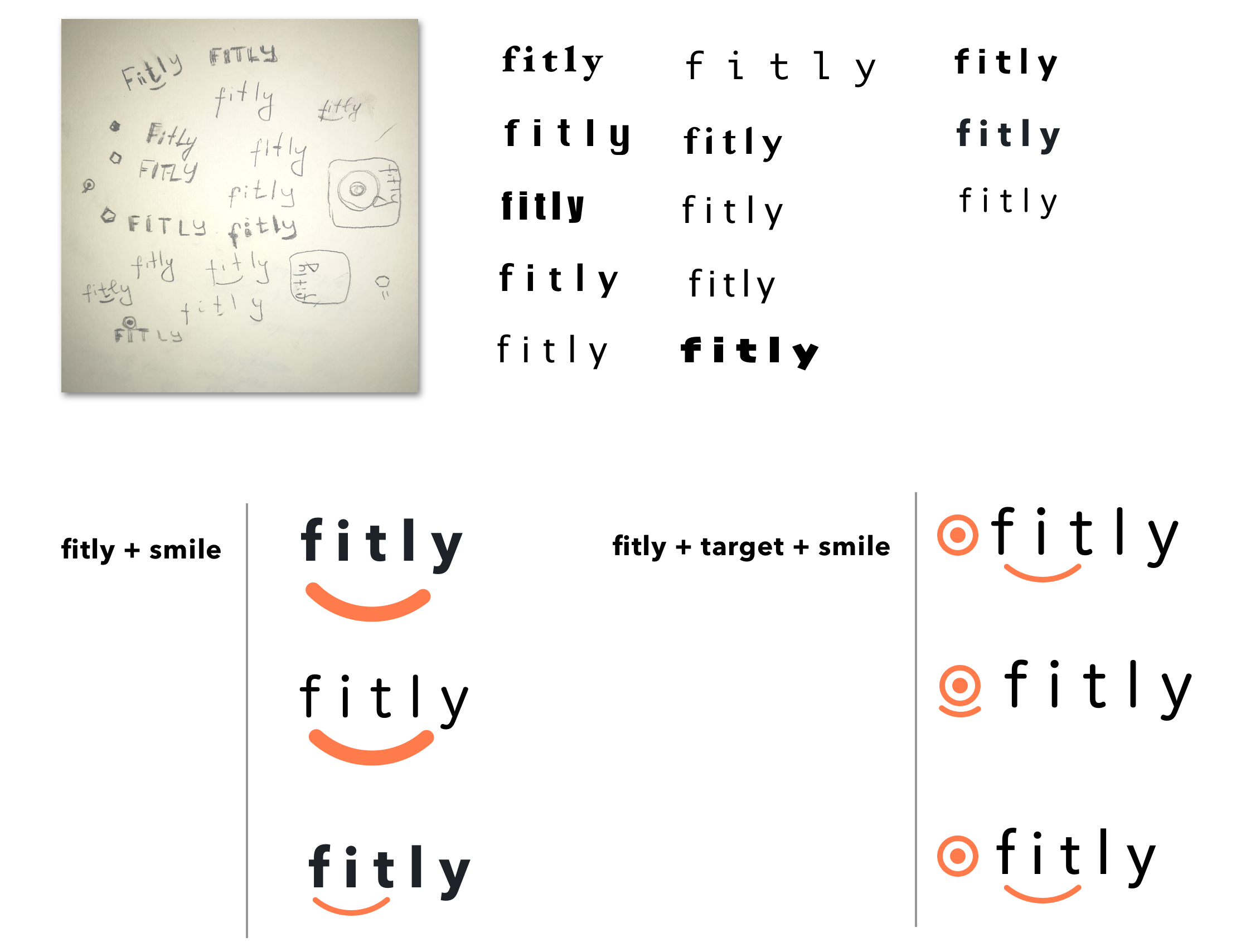 Since the app is aimed at helping users to achieve their health goals, the symbol goal achievement is associated with is target. Sense of accomplishment motivates my persona to work out and increases her emotional well-being. Keeping in mind “what we are not”, I started exploring the idea of “fit for happiness” and experimenting with “targets” and “smiles” for the brand logo.